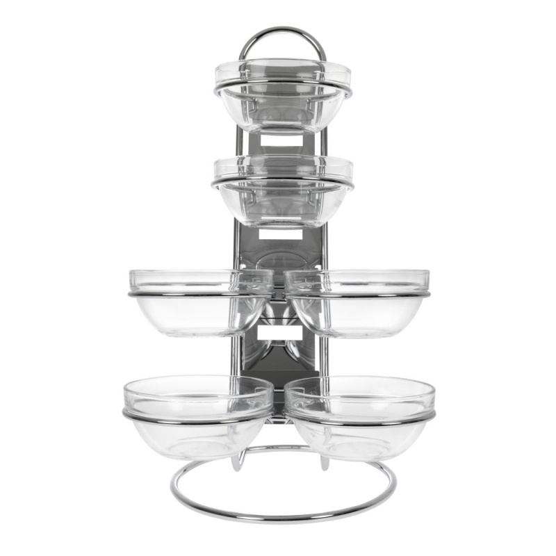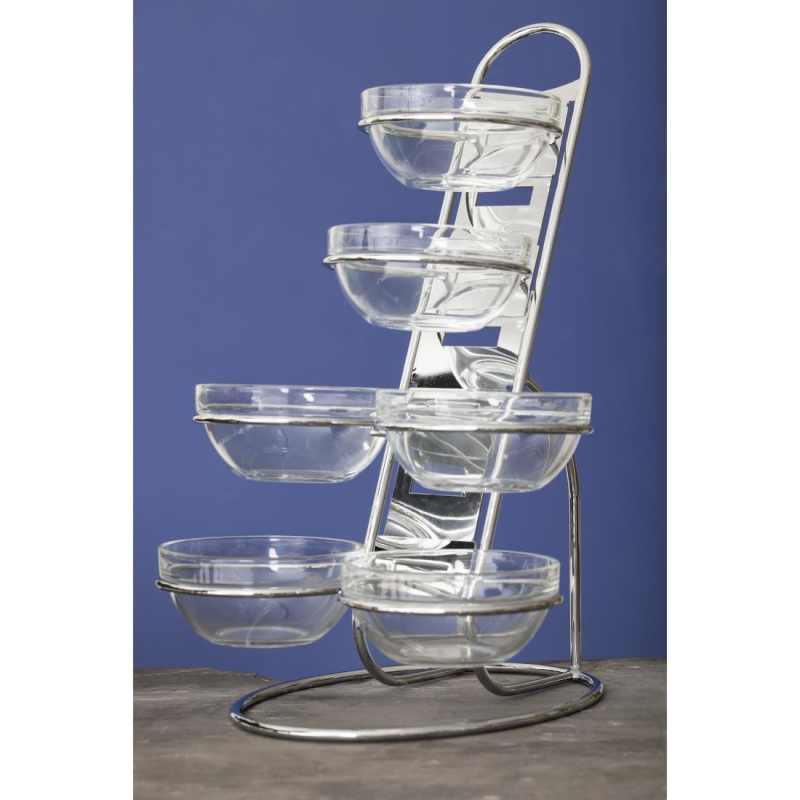 Verchroomde buffetladders met glazen schalen. Ladder sets worden geleverd met vier kommen, 2 enkele schaal ringen en een dubbele schaal ring (onderdelen en polycarbonaat deksels zijn apart verkrijgbaar). Ideaal voor buffet gebruik.