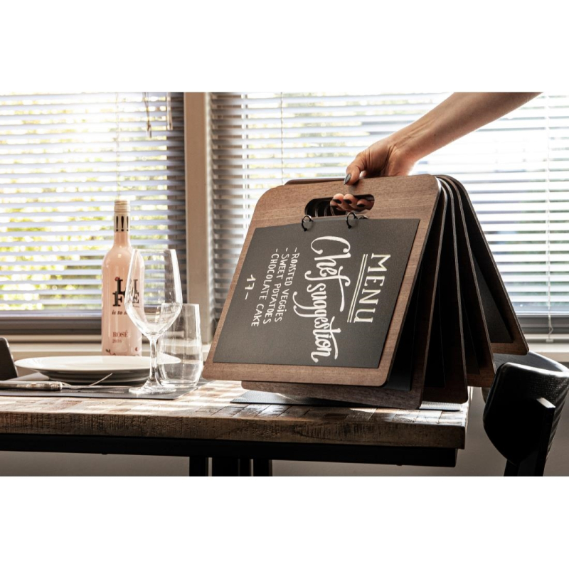 Een tijdloze klassieker; Handgemaakte menukaarthouder van gelakt notenhout; Inclusief 1 flexibele krijtbordpagina;