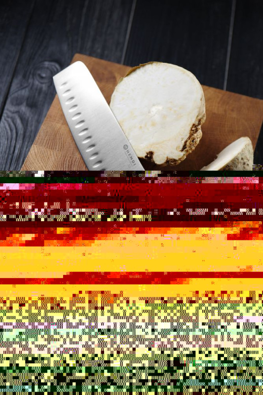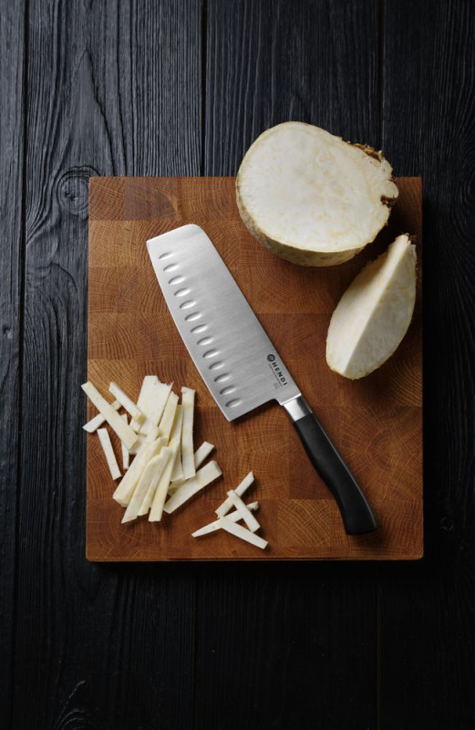 Alle messen worden nauwkeurig gesmeed uit één stuk koolstofrijk Duits roestvaststaal. De speciale Chroom-Molybdeen-Vanadium legering X50CrMoV15 staat garant voor de volgende eigenschappen: - vlijmscherp - duurzaam scherp snijvlak - goed slijpbaar - zeer corrosiebestendig Bij de productie van elk mes zijn wel 50 stappen betrokken. Traditionele vaardigheden en nauwkeurige machines vervolgen het slijpen en polijsten, tot uiteindelijk het snijvlak wordt aangebracht onder de ideale hoek voor het betreffende mes. Het handvat combineert balans, veiligheid, ergonomie en controle met een exclusief uiterlijk. Elk mes wordt individueel verpakt in een fraaie PET blister.