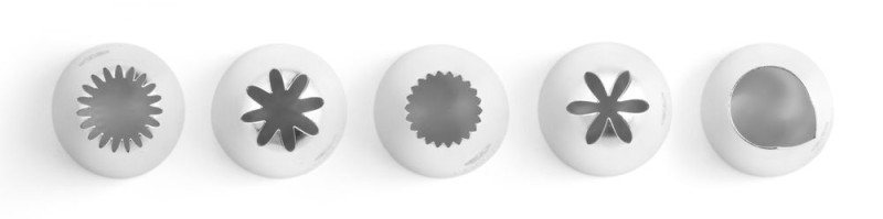 Set bestaat uit 5 spuitmondjes voor decoratie: - 2x closed Star - 1x drop Flower - 1x french Star - 1x v-shaped. Extra nauwkeurig dankzij scherpe randen.
