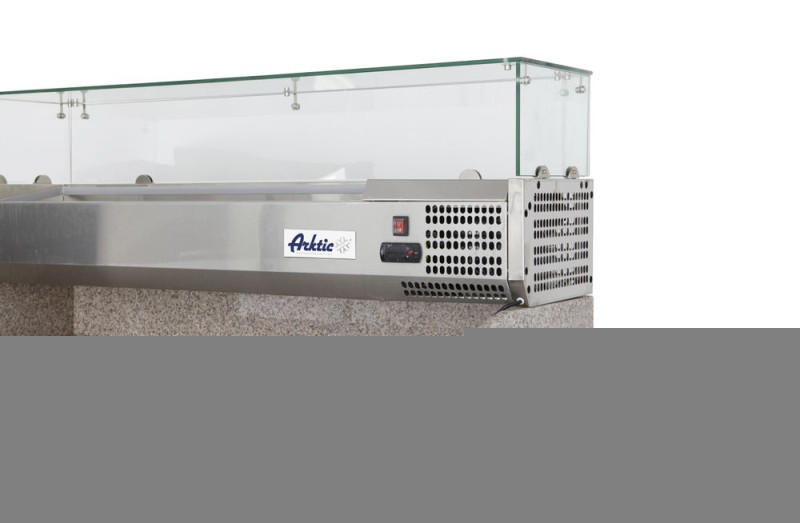 Met aparte koelvitrine voor 6 x GN 1/4 bakken (max. hoogte 150 mm). De koelvitrine wordt gekoeld door middel van statische koeling. Koelvitrine afmetingen: 1405x335x(H)255 mm. Koelruimte afmetingen: 1295x595x(H)500 mm. Polyurethaanschuim isolatie, 35 mm dik. Inclusief 3 schappen (335x570 mm). Maximum capaciteit 15 kg per stuk (bij gelijkmatige verdeling van het gewicht). Energielabel (enkel werkbank): A (A+++-G).