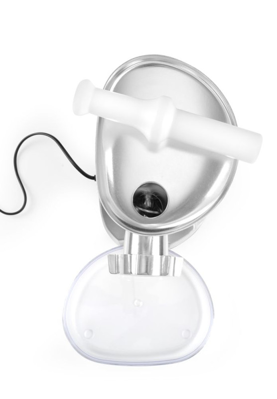 Ideaal voor kleine hoeveelheden en worsten maken, niet voor professioneel gebruik. Aluminium behuizing. Gietijzeren invoerbak met vleeshouder en stofdeksel. Stamper van plastic. Aluminium wormschroef en roestvast stalen mes. Inclusief 2 platen ø65,8 mm: 4 mm en 7 mm perforaties. 3 vultrechters voor worsten: ø12, 15 en 20 mm. Filet. Americain accessoire. Aan/uit/achteruit schakelaar. Niet voor continu gebruik. Gewicht 5,2 kg.