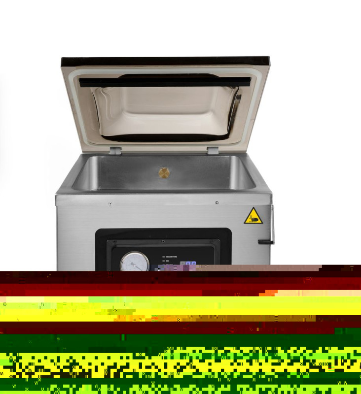 410 mm lange sealstrip, 3 mm breed. Instelbare vacuüm, seal, inlaat en koeltijden, automatische en handmatige bediening. Geschikt voor het vacuüm verpakken van vloeistof en nat voedsel. Voorzien van digitaal display en analoge vacuüm meter. Hoogwaardige oliepomp biedt hoge druk (1009mbar) en trekt snel vacuüm. Behuizing en vacuüm kamer van roestvast staal. Een grote uitsparing in de kamer en de koepel op het transparante deksel maken het mogelijk om grote porties te verpakken. Met klemmen aan de binnenzijde om zakken op de plaats te houden tijdens werking. Pomp capaciteit: 333,3 L/min. Kamer afmetingen: 425x457x(H)100 mm