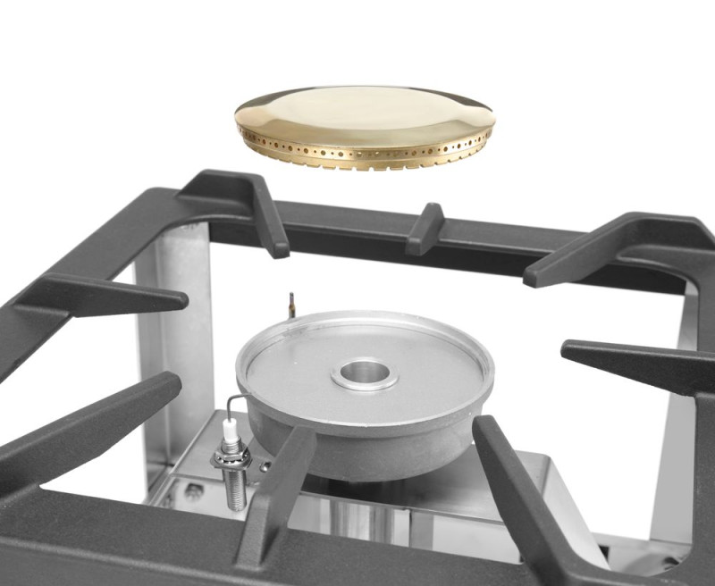 Model Kitchen Line - voor propaan- en butaangas. Volledig roestvast stalen frame. Uitgerust met thermokoppel en elektronische ontsteking. Voorzien van geëmailleerde pandrager. Wordt compleet geleverd met gasslang en drukregelaar.