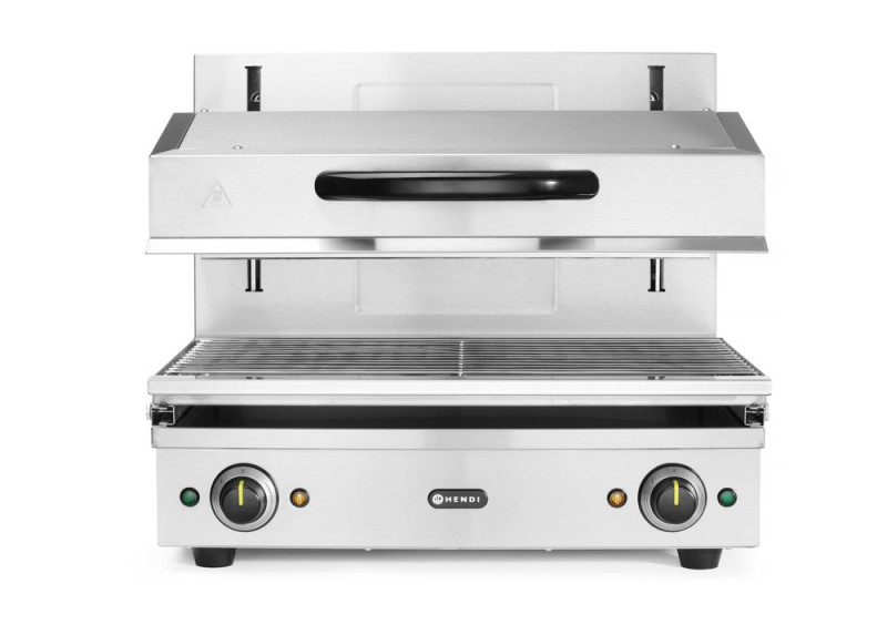 Type 600 - roestvast stalen frame. Ideaal voor grillen of het opwarmen en warmhouden van gerechten. Thermostaat traploos instelbaar tot maximaal 300°C, met controlelampjes. 2 afzonderlijk instelbare warmtezones. Hoogte variabel instelbaar door licht lopend liftsysteem. Verwijderbare lekbak met rooster van 590x350 mm.